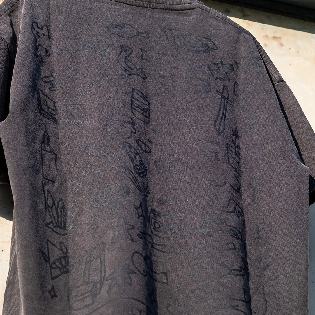 A washed charcoal T-shirt with a tonal all-over doodle print on the back, featuring random sketches, symbols and WeNeed chaos woven into the fabric. The artwork uses a see-through / hide-and-seek effect: depending on how the light hits the fabric, the graphics appear or fade, creating a subtle moving texture.