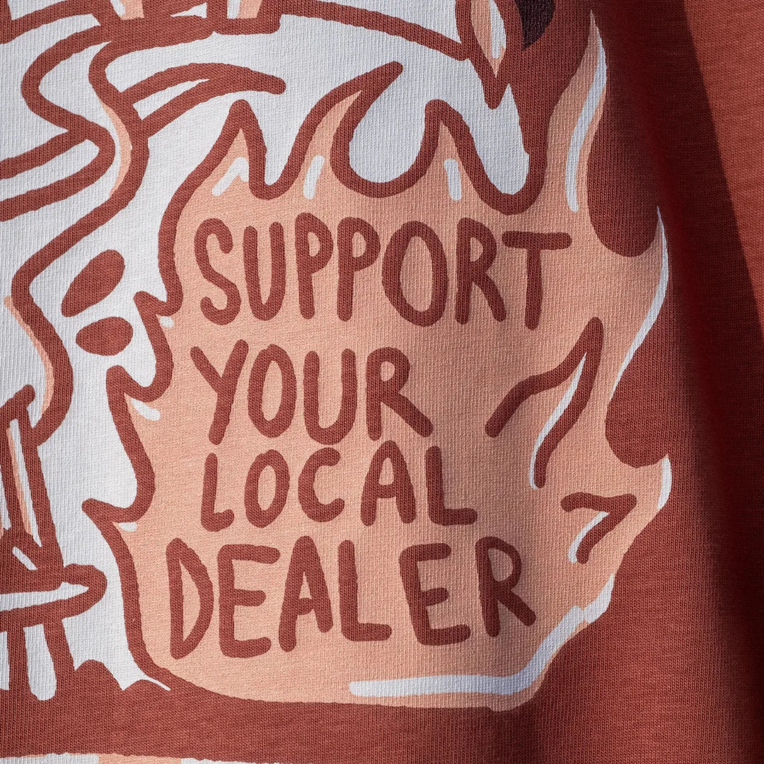 Below him, the flame-shaped graphic reads “Support Your Local Dealer”, keeping the signature irreverent WeNeed vibe.